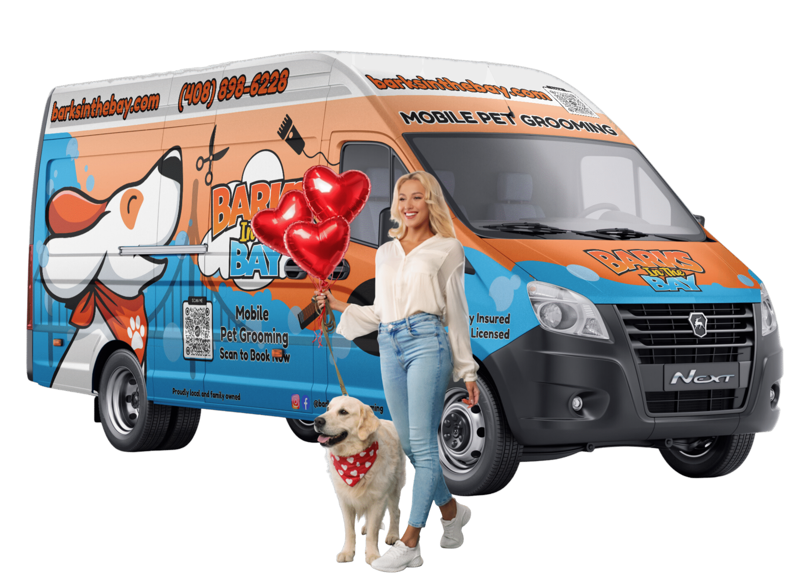 Unlike others, our dog grooming van is cage-free, fully electric, whisper-quiet at just 30 dB, compared to noisy 100 dB gas generators from other companies. That means a calmer dog, a happier you, and the entire neighborhood says thank you!